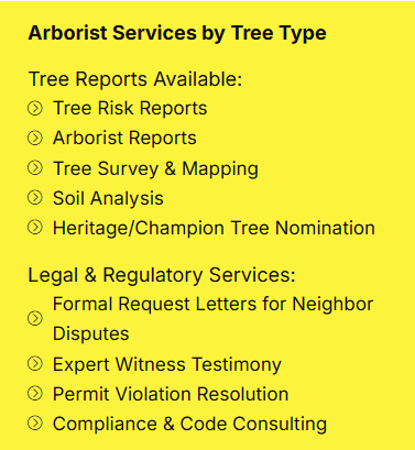 - Certified Arborist Reports: These formal documents include Tree Risk Reports, Insurance Documentation, Legal Dispute Support, Tree Inventories, and more.